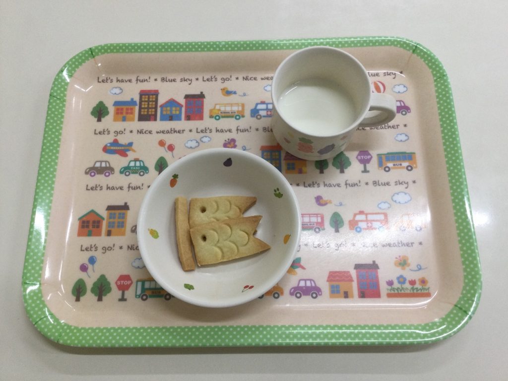 給食は、お楽しみ給食です。[アンパンマンごはん、鶏のからあげ、ポテトサラダ、すまし汁、オレンジゼリー、バナナ]、おやつは[こいのぼりクッキー]でした。