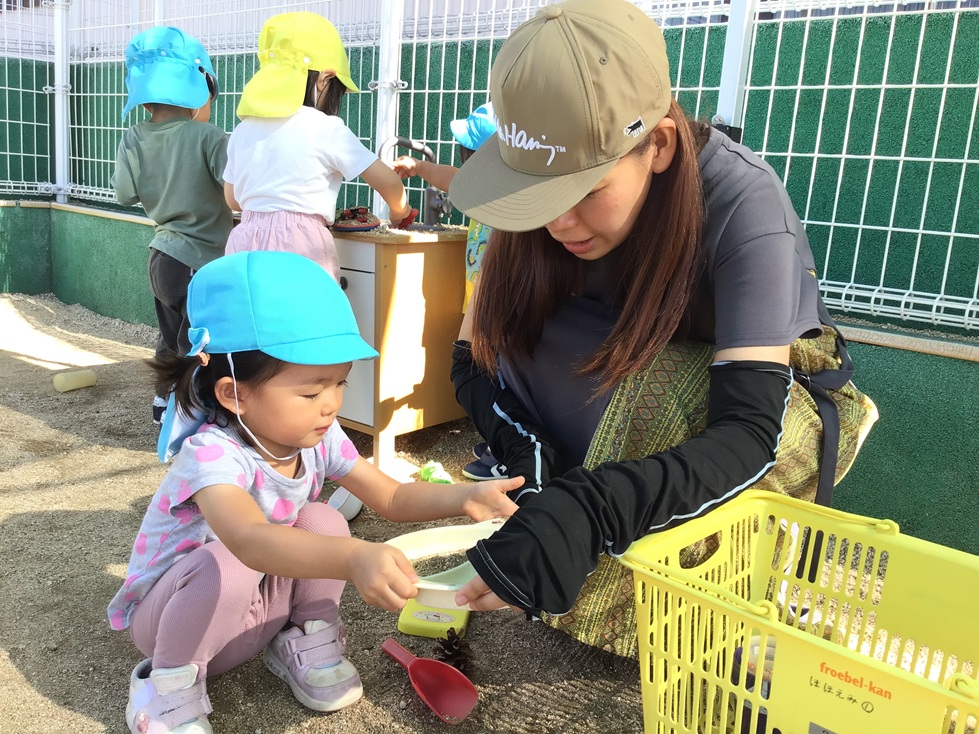 ままごとでは、お母さんにたくさんのごはんをつくり、食べさせてあげていました。