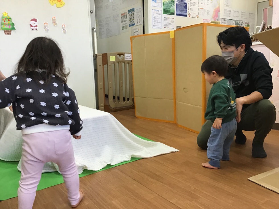 箱の後ろに上手に隠れたり、「みーつけた!」と隠れているお友だちを探すこともできました。