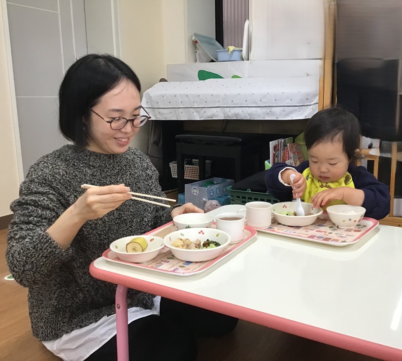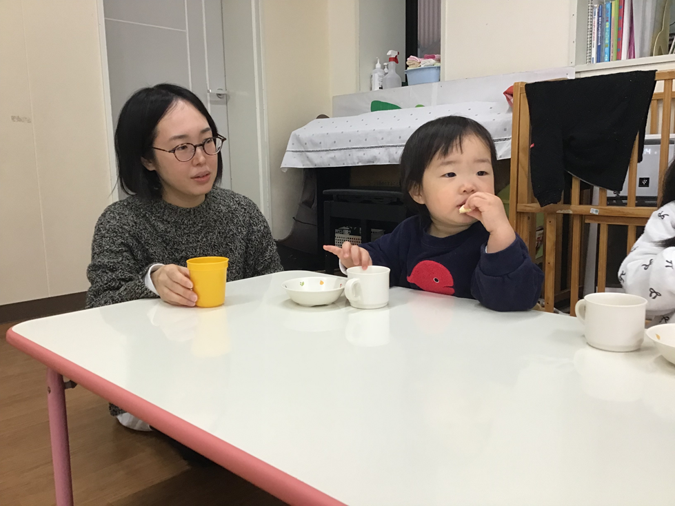 朝のおやつでは、大好きなお母さんと「おいしいね!」