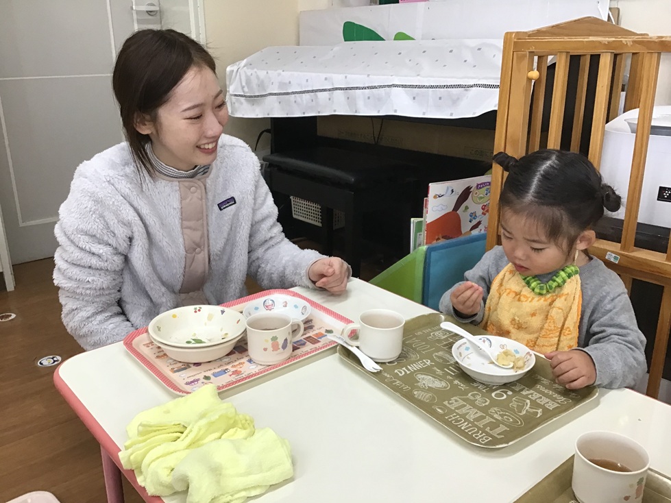 朝のおやつでは、大好きなお母さんと「おいしいね!」