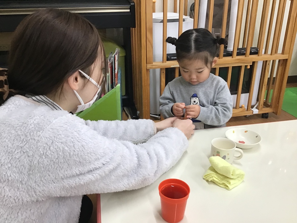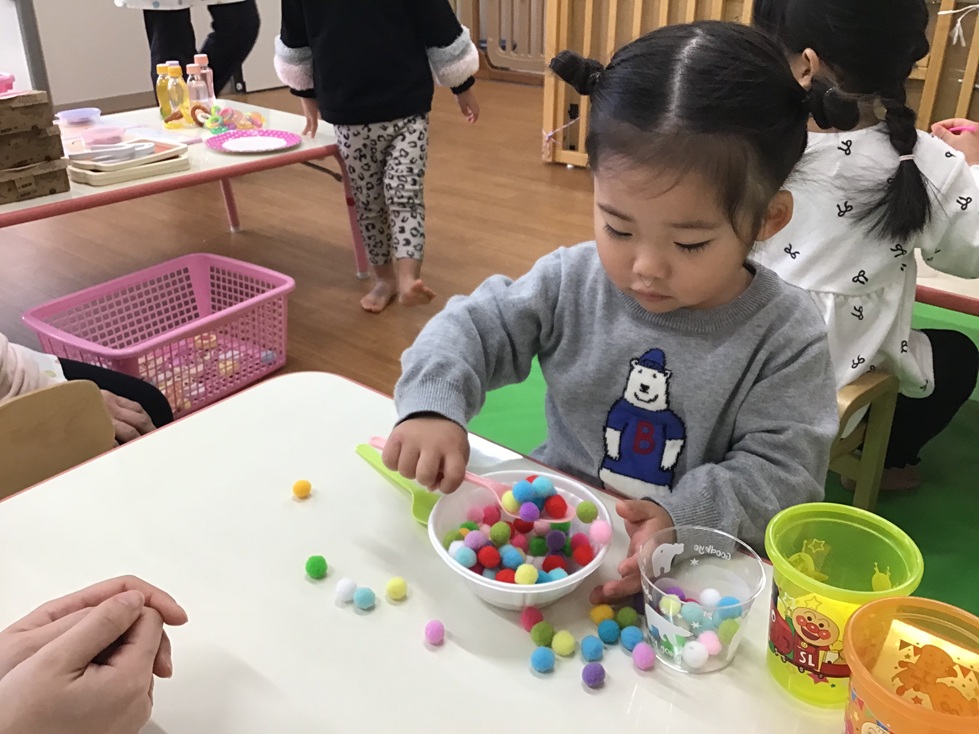 お部屋の中でコーナー遊びをしました。スプーンあそび、手作りおもちゃ、おままごとなど好きな遊びをみつけて遊びます。