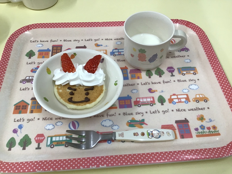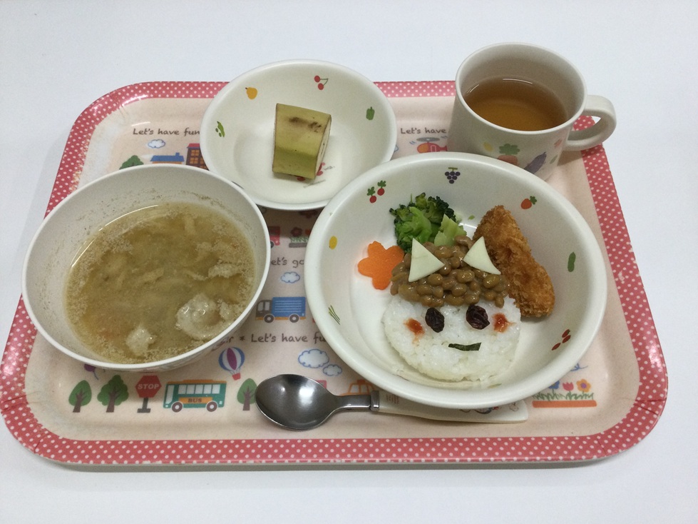 頑張った後のお楽しみは、節分のスペシャルメニュー! 給食は「オニ納豆ごはん、金棒ササミカツ、豚汁、バナナ」、おやつには「オニホットケーキ」をいただきました。