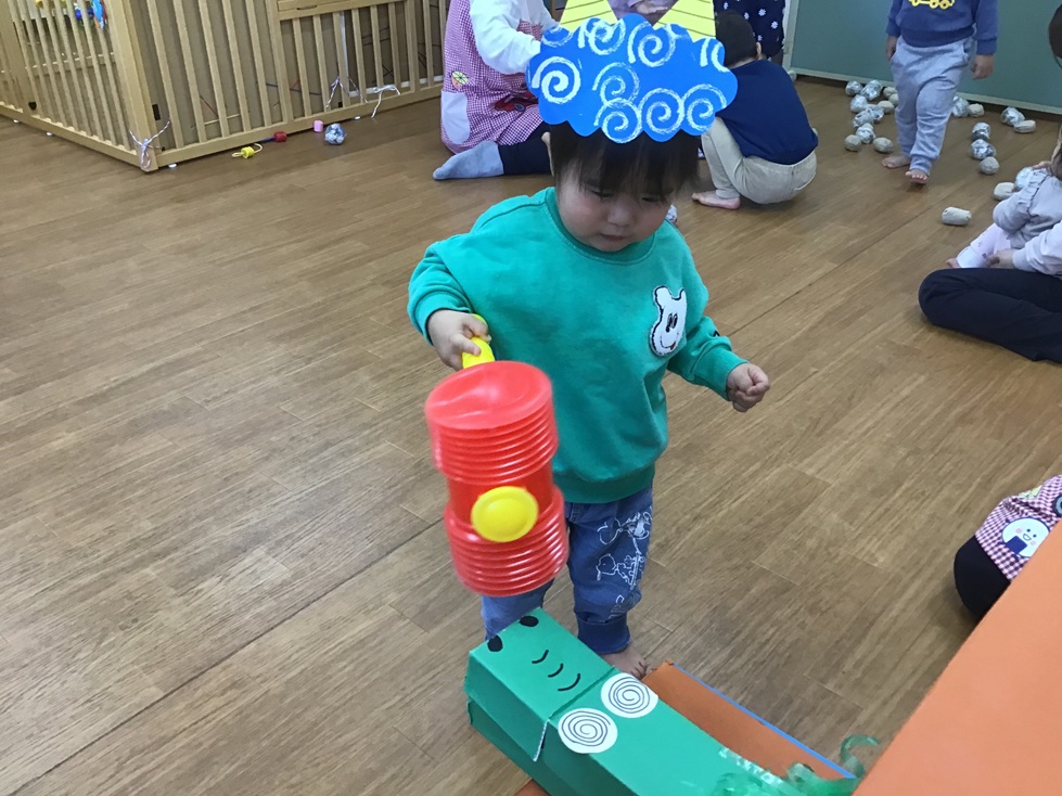 その後は、鬼になりきって元気いっぱい遊びました! 「オニのまめまき」「オニパニック」「オニつり」など、節分にちなんだゲームに子どもたちは大興奮です。