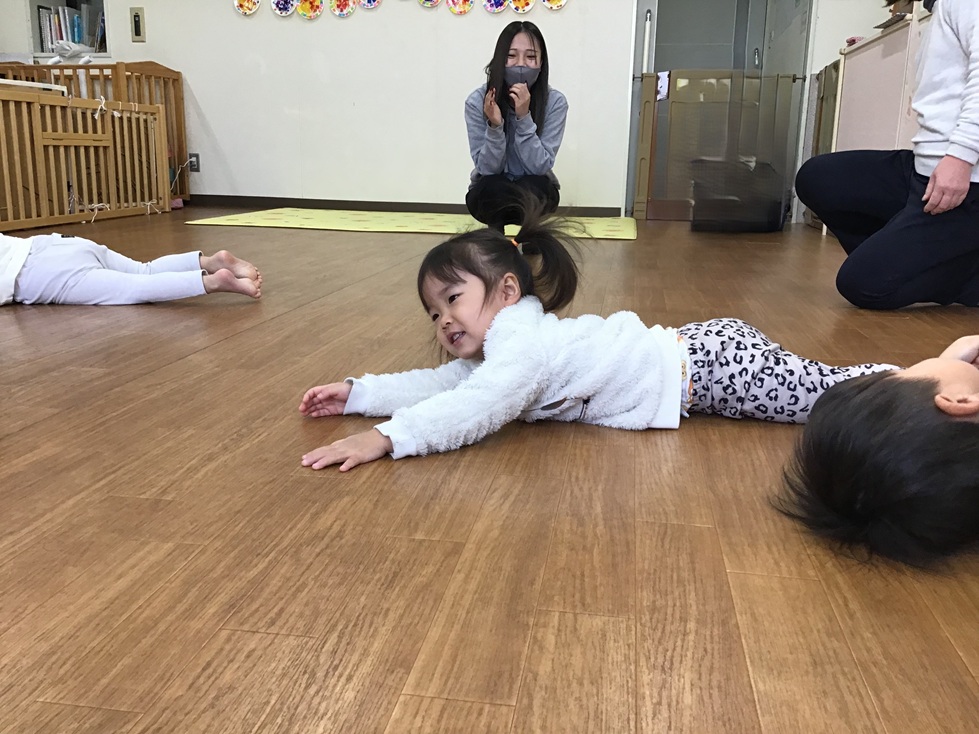 次はリズム遊びです。ピアノの音をよく聞いて、変身!お母さんに見守られながら、のびのびと身体を動かして楽しみました♪